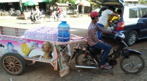 Iz modre posode, v kateri sta voda in led, teče voda po cevi do motorja in potem na tla.