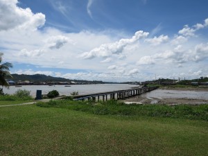 Levo čez reko/morje je glavni del ‘vodne vasice’. Midva sva si pogledala samo del na desnem delu slike.