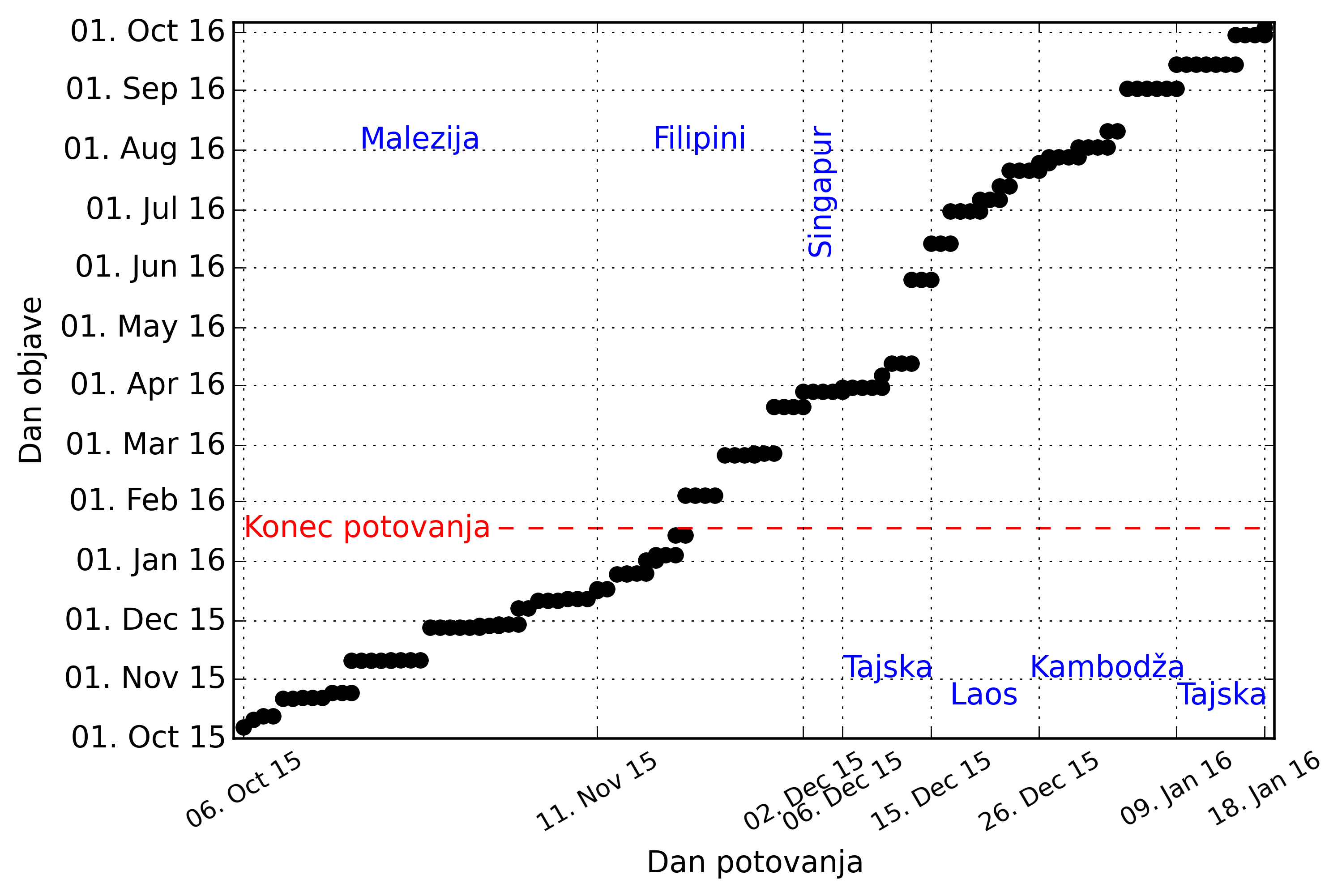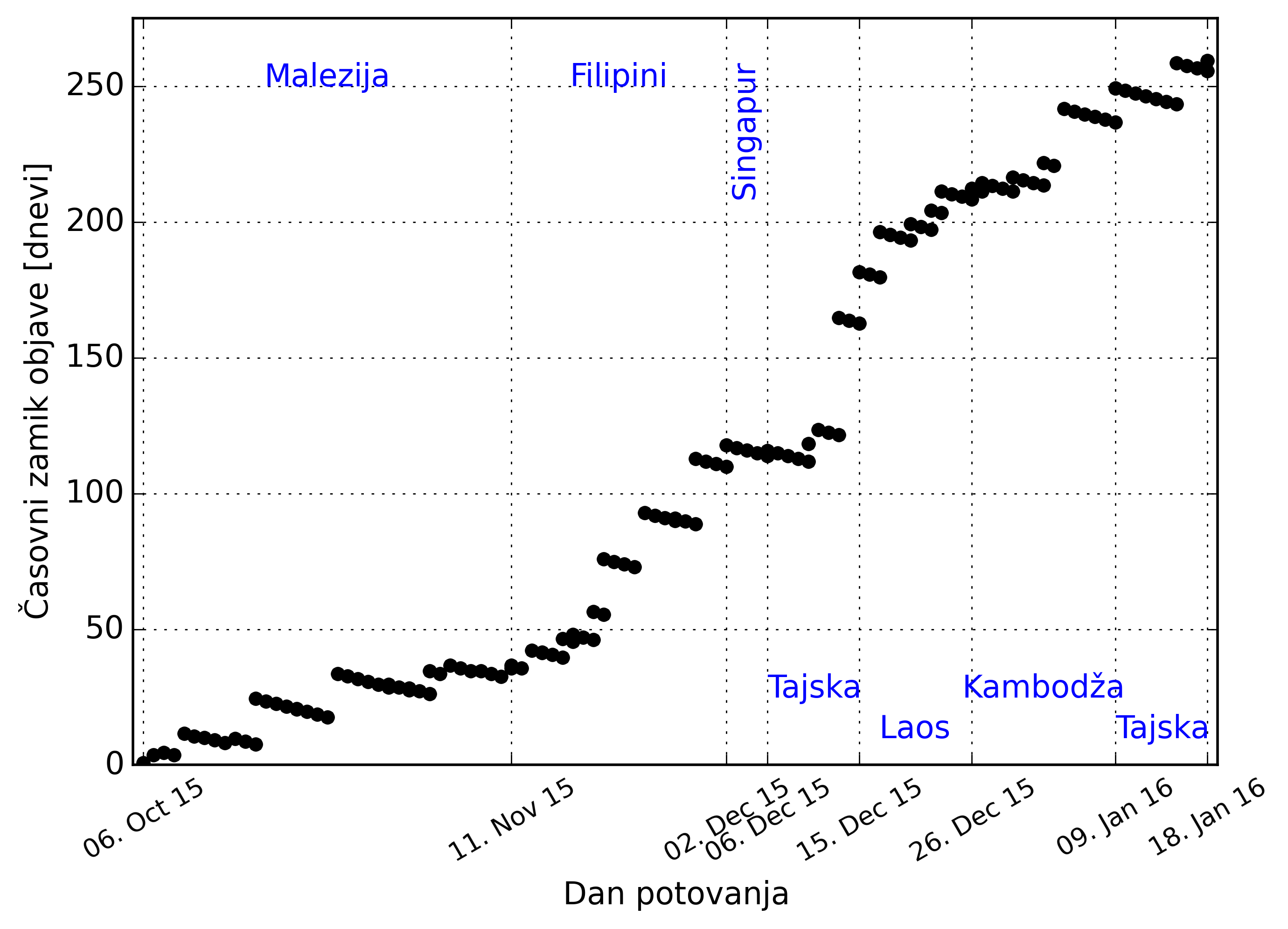 Na potovanju sva se enajstkrat peljala z avionov, drugih prevoznih sredstev pa nisva štela. Na blog sva napisala 50 prispevkov z 26060 besedami v tekstu ter 5631 besedami pri opisih 13451 slik. To je v povprečju 300 besed in skoraj 13 slik na dan potovanja. Posnela sva skoraj 17000 slik , kar je povprečno 160 na dan. Koliko videa sva posnela še nisva izračunala, objavila pa sva 29 posnetkov v skupni dolžini dobrih 41 minut. Z blogom sva vedno bolj zaostajala, tako da sem zrisal graf, koliko časa po dogodku sva napisala prispevek v odvisnosti od dneva potovanja.